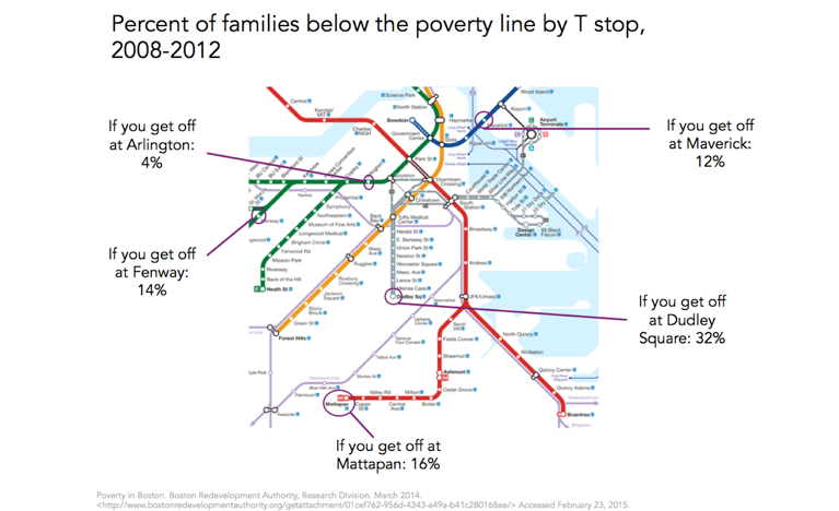 As we well know, these health indicators are closely linked to a broad range of social indicators that are unevenly distributed across the city. Poverty is a frequently used summary indicator of socioeconomic position, well established as a marker of a broad range of other adversities. It is then not surprising, given the map above, that poverty rates in some parts of Boston are four to eight times higher than those surrounding the healthier stops on the T (Figure 2).
